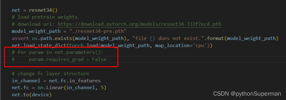 如果要训练网络中的所有参数,注释掉这两句话就可以了。