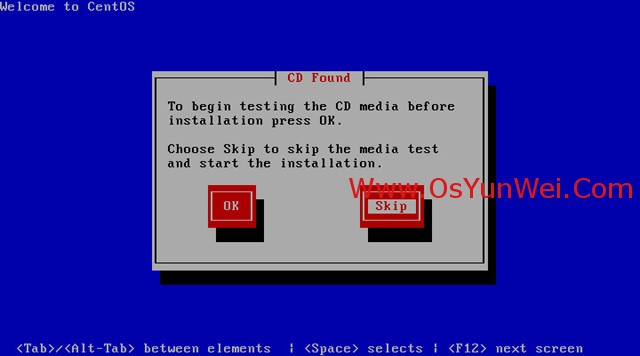 按键盘上的Tab键,把光标定位到skip,然后回车(跳过光盘镜像检测)