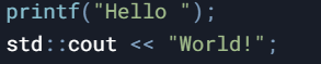 由于 stdio 和 iostream 使用不同的缓冲区,可能输出 World!Hello(顺序错误)。