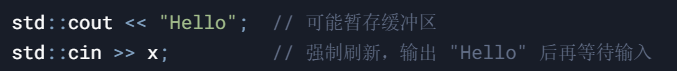 例如,cin 和 cout 默认绑定(tie)(通过 cin.tie(&cout)),导致每次 cin 输入前,系统会先自动强制刷新 cout 的输出缓冲区,确保所有之前的输出已经显示。