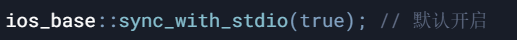 默认与 C 的 stdio 同步(sync_with_stdio(true)),以保证混合使用时顺序正确,但会降低性能。
