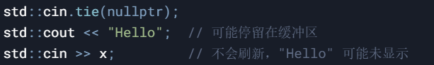 std::cin.tie(0)(优化):cin 不会自动刷新 cout,但需手动刷新缓冲区(手动调用 flush )以确保输出顺序正确