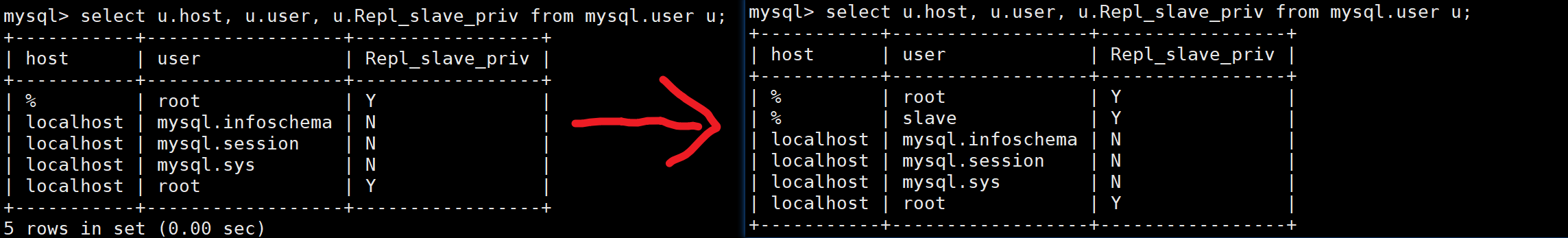 select u.host, u.user, u.Repl_slave_priv from mysql.user u;