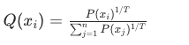 从公式可见,温度参数通过指数运算改变概率间的相对权重。当温度为1时,$1/T = 1$,公式简化为