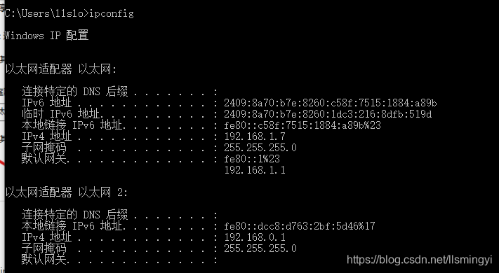2.查看主机以太网适配器的IP,使用命令ipconfig