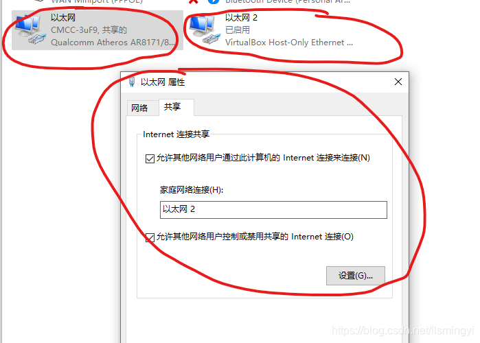 - 选择共享当前的以太网(也就是主机的网络适配器),在下图中是以太网(CMCC-3uF9),共享给虚拟机创建的以太网2.