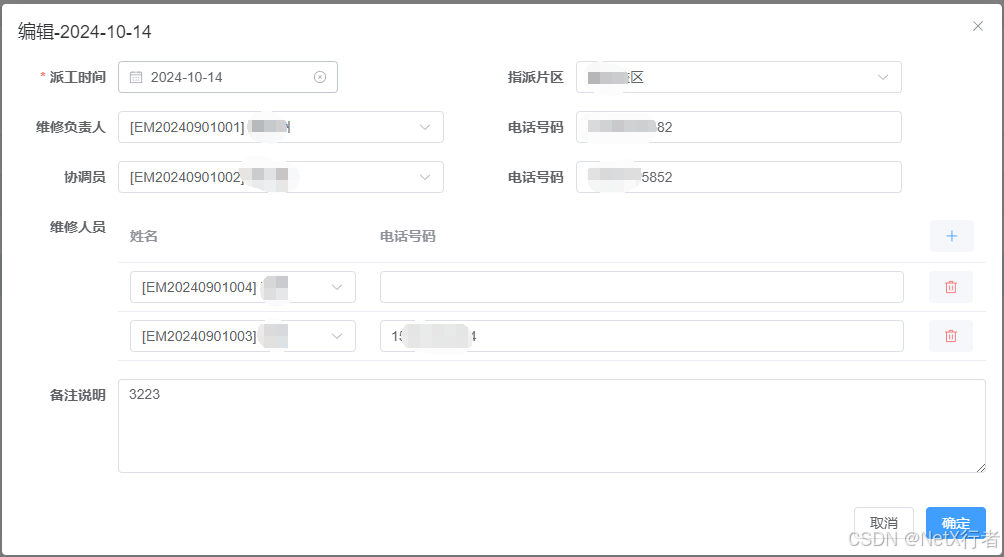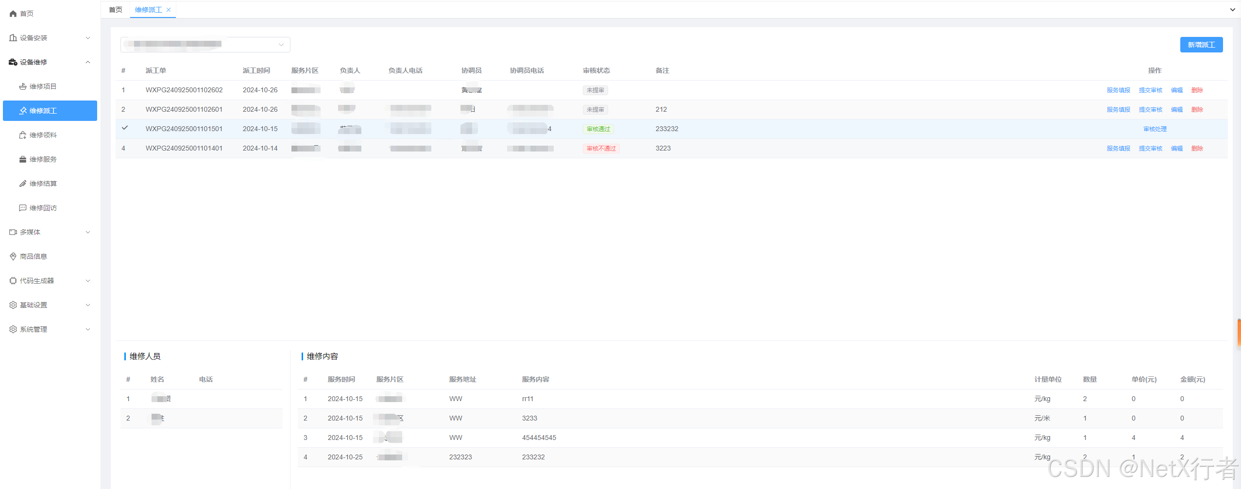 - 维修派工:以派工的形式来管理每一次的维修服务。每一次派工都需要指定一个维修负责人、协调人及维修人员。完成本次派工维修后,维修负责人负责录入本次服务内容,提交公司领导审核,该服务内容即做为公司与业主结算的服务内容项目, 同时也为公司计算个人工作业绩的依据。参考界面如下: