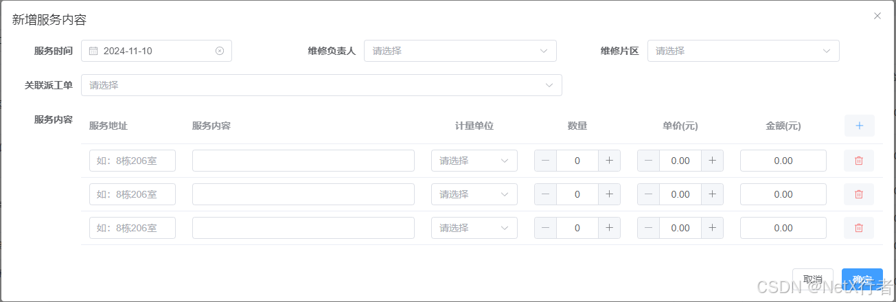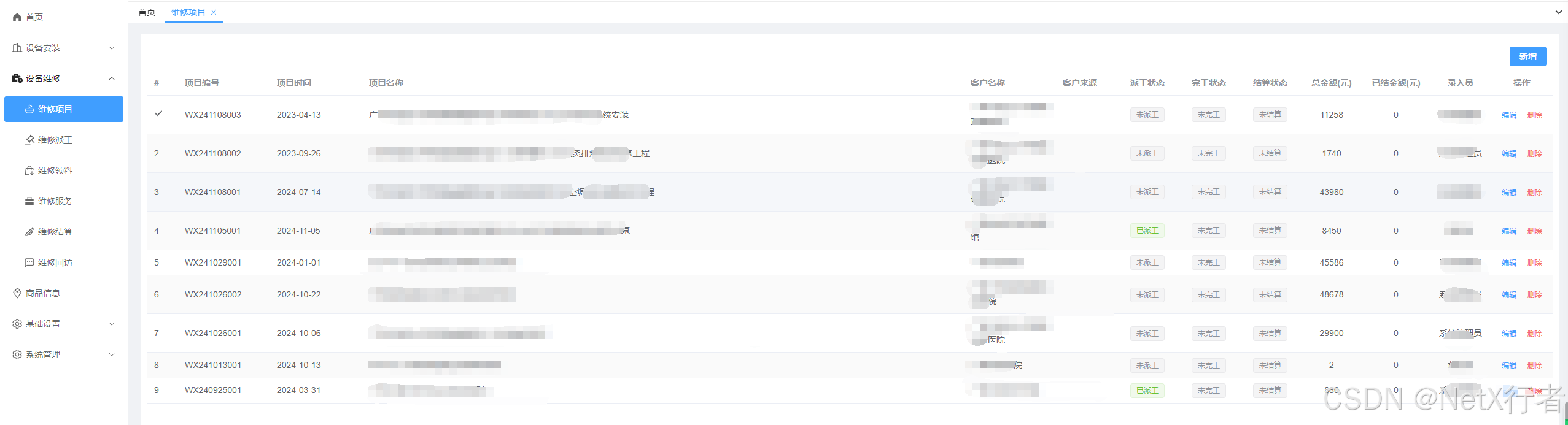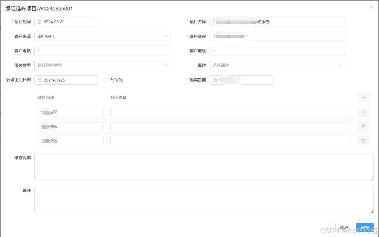 - 维修项目:系统以项目为管理主线,该功能模块主要负责登记维修项目信息。包括项目时间、项目名称、客户信息、客户来源、项目涉及的片区等等,参考界面如下: