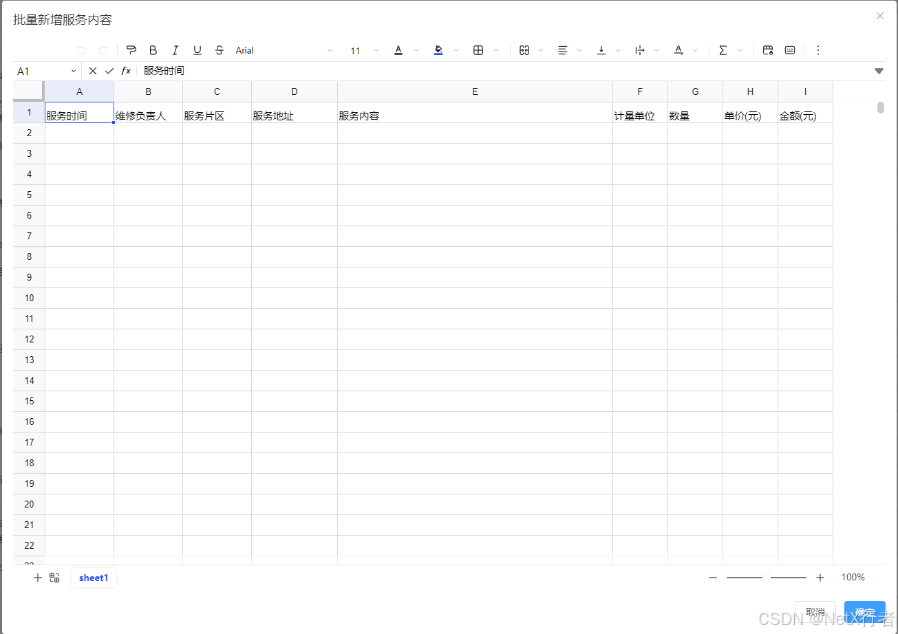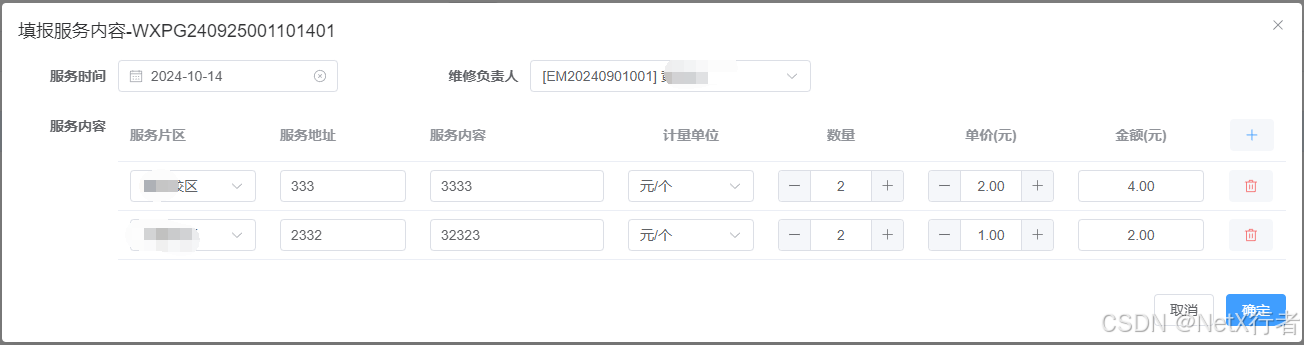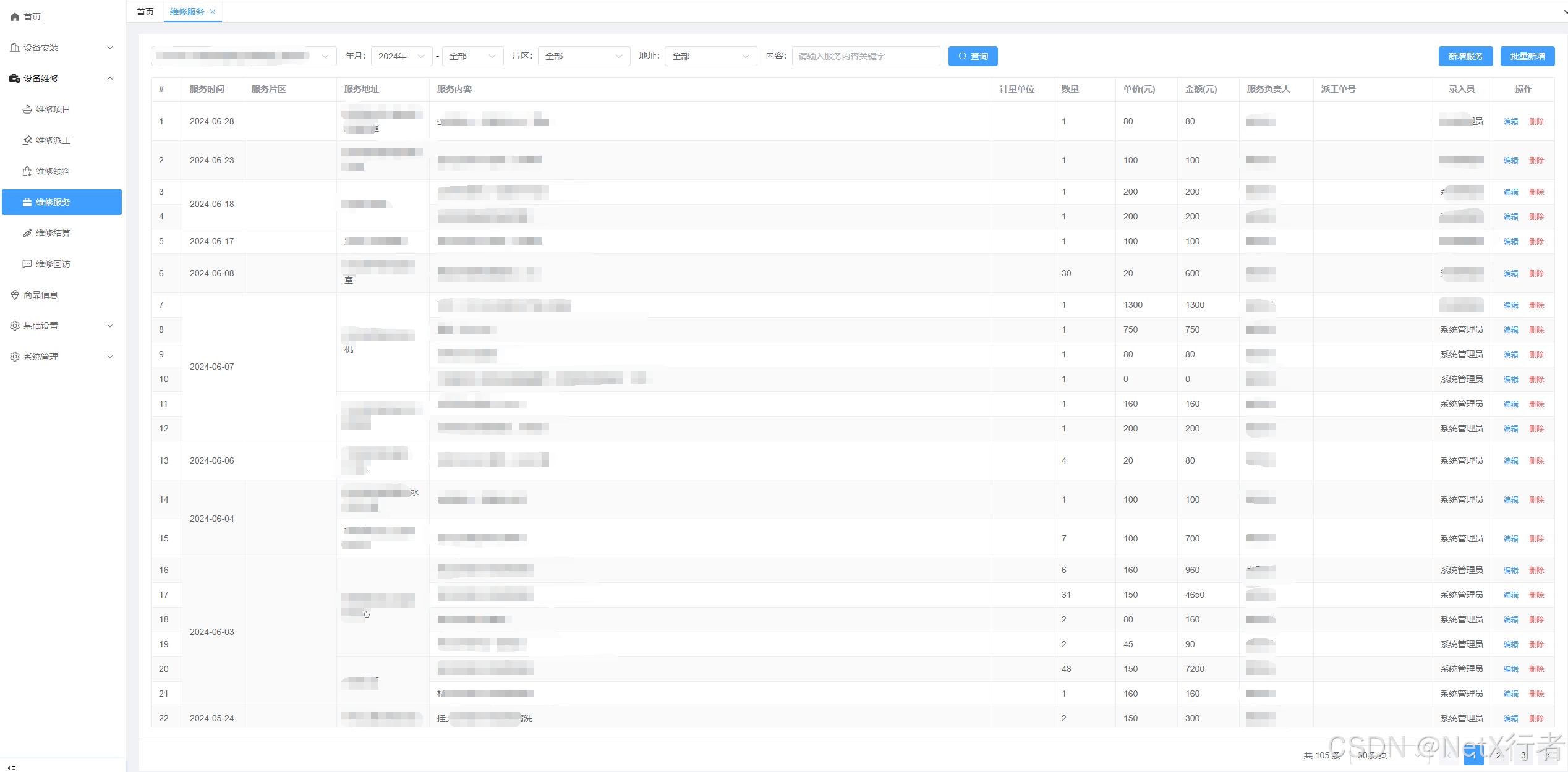 - 维修服务:该功能模块用于管理项目各个时间段的维修服务内容,项目维修服务内容除了派工维修负责人在完成服务后,通过“服务内容填报”功能完成服务内容录入之外,也可以直接通过该模块录入服务内容,在此功能模块中,还开放了批量录入功能。参考界面如下: