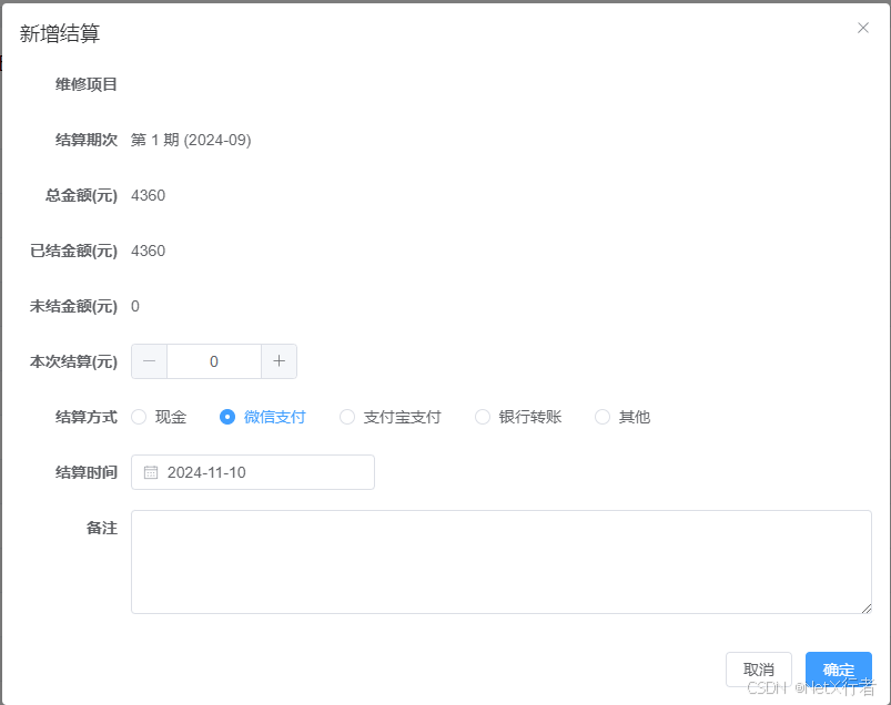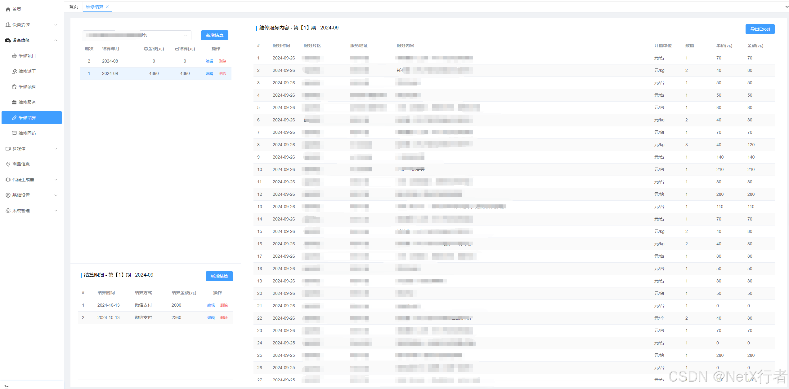 - 维修结算:该功能模块主要管理业主的支付结算功能。以批次来管理结算,系统默认以一个月为一个结算期次。每一个结算期次服务内容确认后,可适应多次支付的情况,系统自动汇总总额,已支付金额及未支付金额。同时提供直接导出本期服务内容Excel表格。参考界面如下: