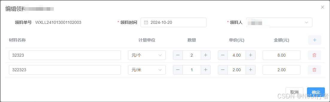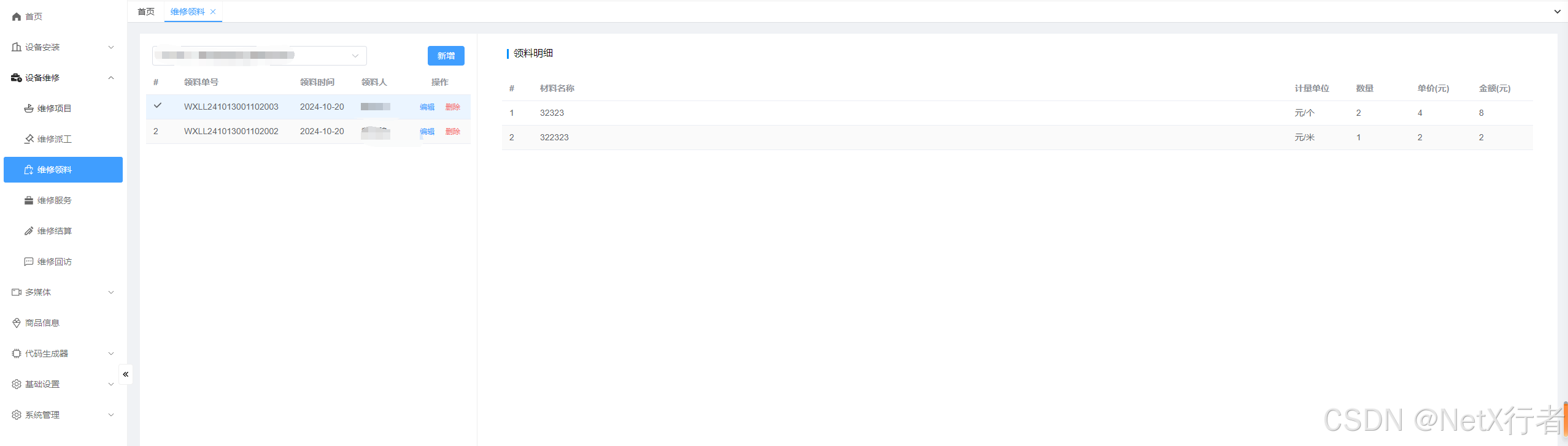 - 维修领料:用于记录每一次进行项目维修服务时的材料领导明细,能从侧面体现出项目的服务成本。界面如下: