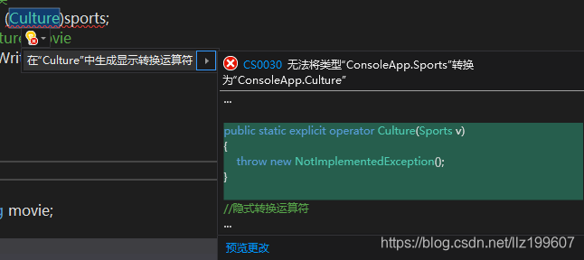 碎碎念:visual studio是一款功能强大的IDE,这里提供了自动补全转换运算符的功能。如下图:(显示应该是显式?)