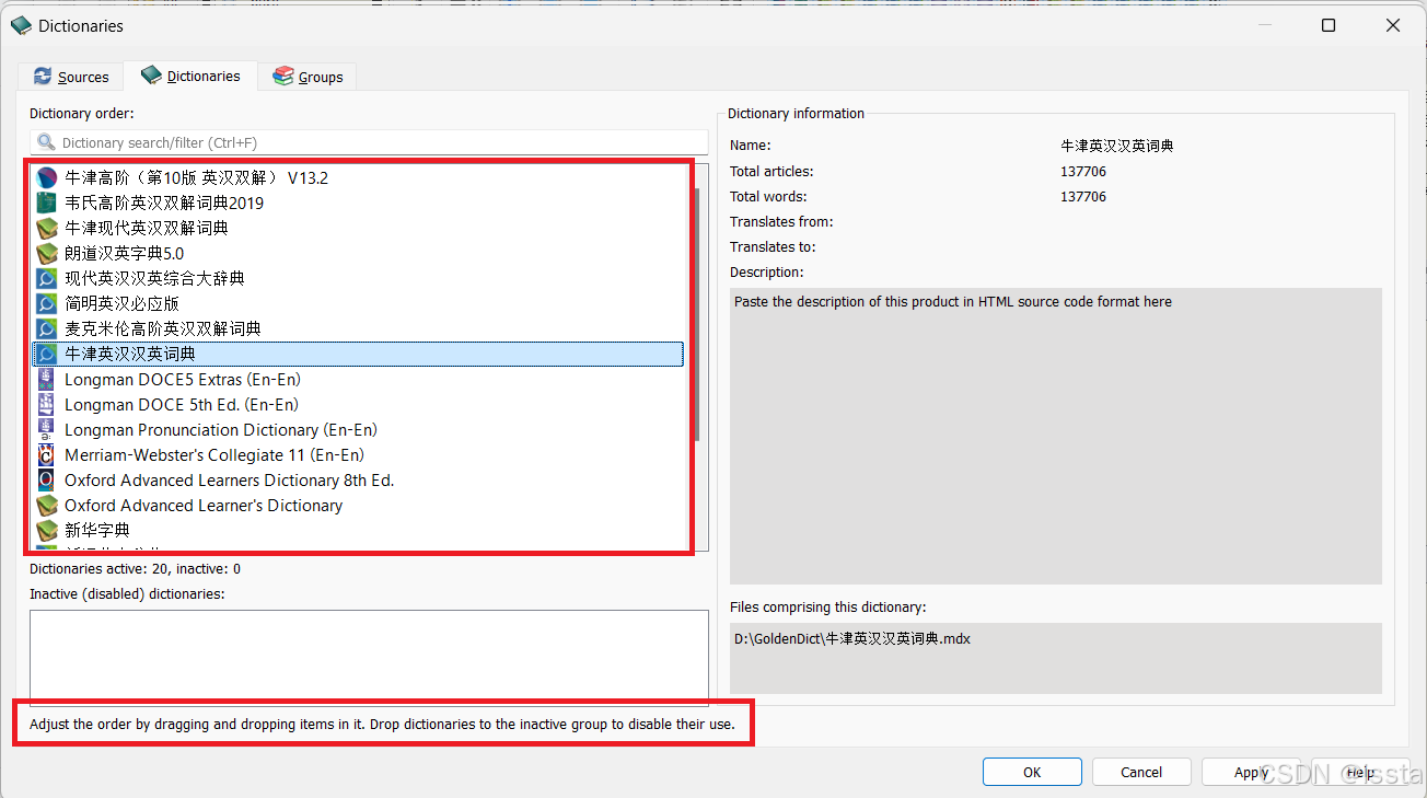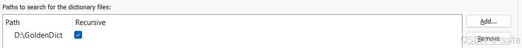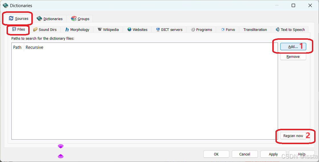 菜单栏选择【编辑】>【词典】,切换到Sources,点击【词典来源】>【文件】> 添加, 选择自定义词典位置打开,此处以D:\GoldenDict为例,点击 重新扫描, 完成后 Apply 应用