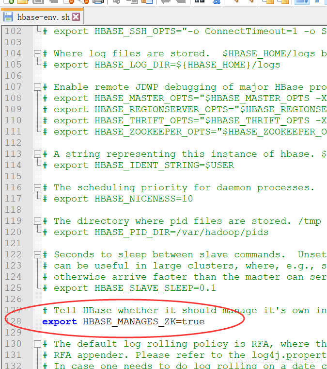 4、配置export HBASE_MANAGES_ZK=true,这个设置是使用hbase自带的zookeeper还是使用外部的zookeeper,设置true是使用自带的zookeeper。