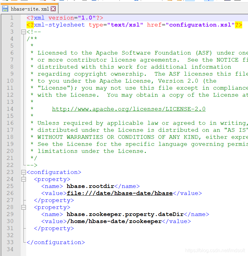 5、修改 conf/hbase-site.xml, 设置 hbase 的数据存储目录以及 zookeeper 的数据存储目录,默认会放到 /tmp 目录下,这个目录机器重启后会清空,所以需要更改目录,配置如下: