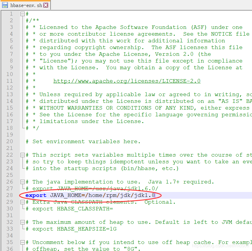 3、修改 /home/rpm/hbase/hbase-1.4.8/conf/hbase-env.sh ,设置 export JAVA_HOME=/home/rpm/jdk/jdk1.8,这个是 java 所在的目录,通过 which java 查看。