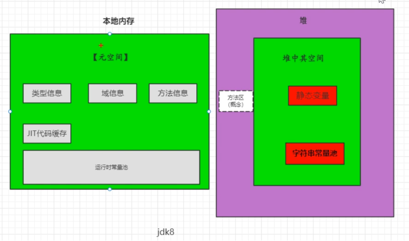 JDK1.8时,方法区挪到了本地内存,不在放到堆中,并且更名为元空间,静态变量与字符串常量池依然存到堆中。
