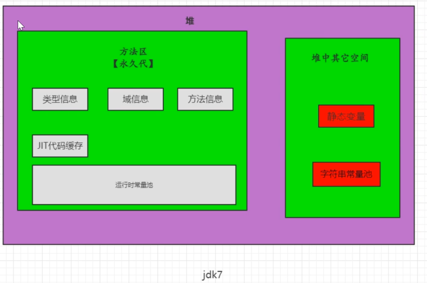 JDK1.7时,方法区依然在堆中,但是字符串常量池不再放到运行时常量池,而是直接挪到了堆中。方法区存储的静态变量也直接挪到了堆中。