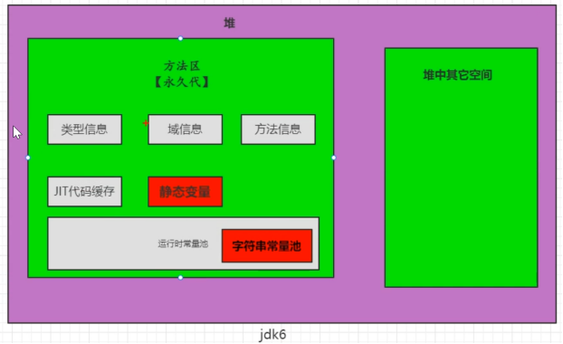 Jdk1.6时,方法区在堆中,运行时常量池在方法区中。1.6之前,方法区称为永久代。1.8之后,方法区称为元空间。真正的实现要么是方法区要么是元空间。