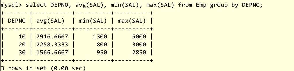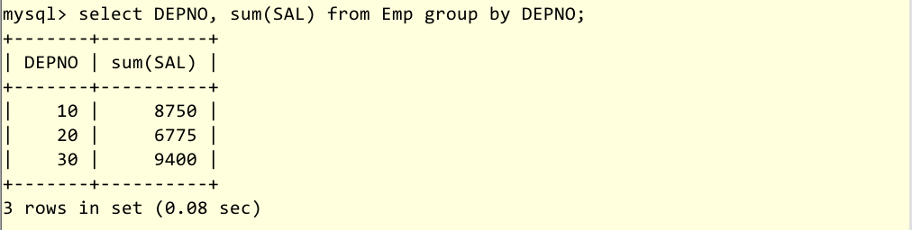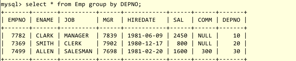 注意:分组后,select输出的字段除了统计的字段外,只能输出分组依据的那个字段。其它的都不合适。