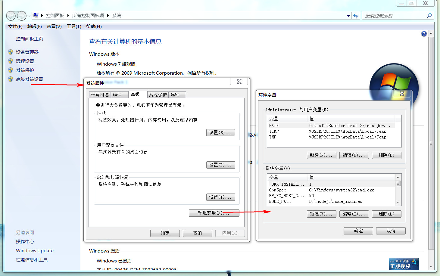 4、配置两个环境变量:一个是PATH上增加node.exe的目录D:\nodejs,一个是增加环境变量NODE_PATH,值为D:\nodejs\node_modules