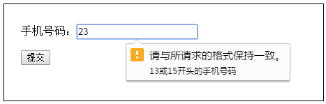 <p>手机号码:<input type="text" name="phoneNumber" pattern="[1]([3]|[5])[0-9]{9}" title="13或15开头的手机号码" /></p>