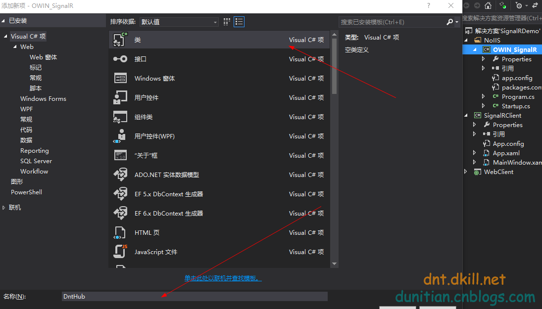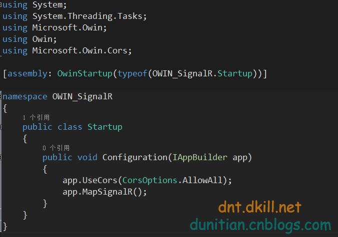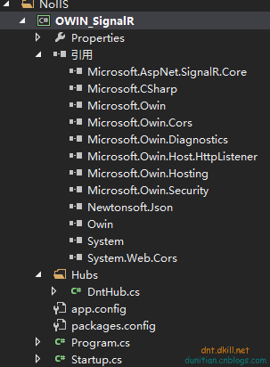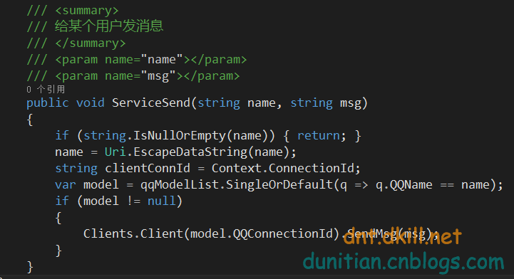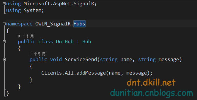 建了一个DntHub,定义了一个服务器端的方法,叫ServiceSend(一会会用到)