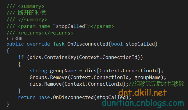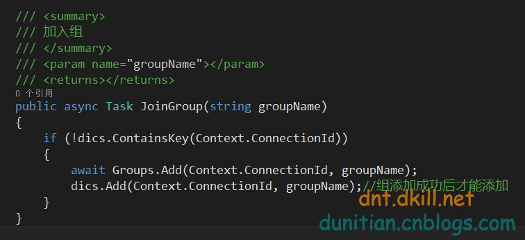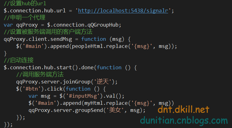 <!-- 总结一下: 1.先引入jq包,再引入signalR的js包,再引入signalR动态生成的hubs 2.设置signalR的hubs url地址:$.connection.hub.url =xxx 3.声明一个代理对象来引用集线器:var chat = $.connection.dntHub; 4.创建一个客户端方法:chat.client.xxxx=function(){} 5.启动并调用服务端方法: $.connection.hub.start().done(function(){ chat.server.xxx() }); -->代码贴起: