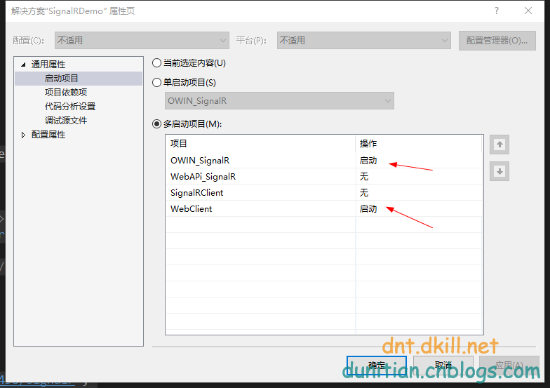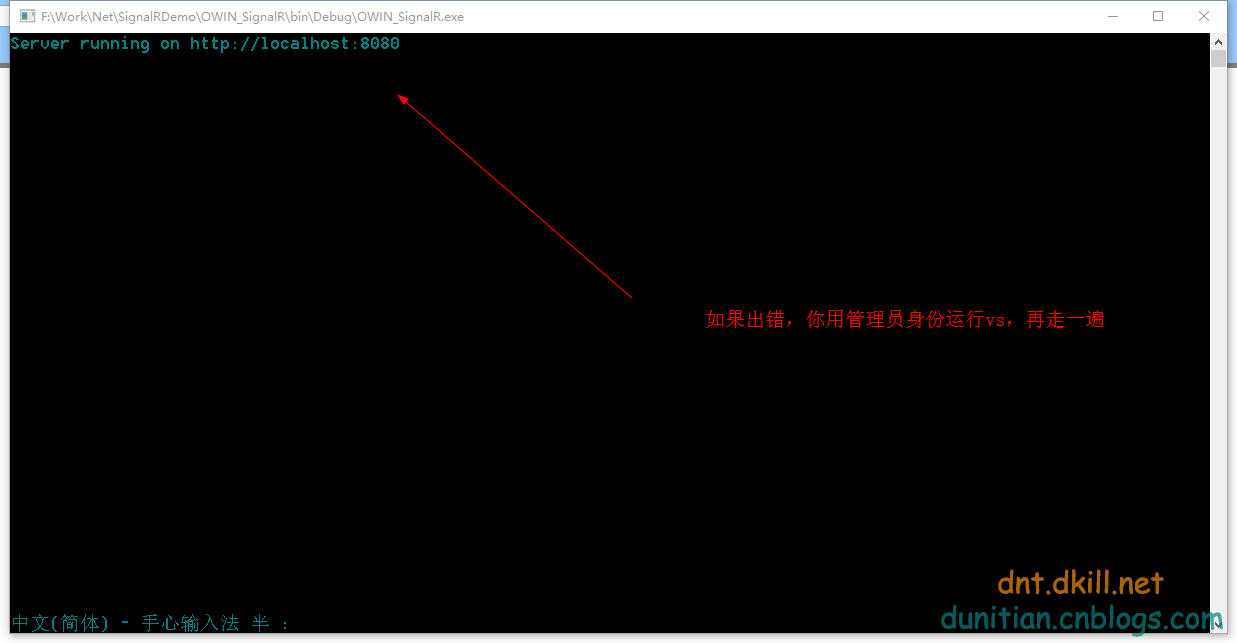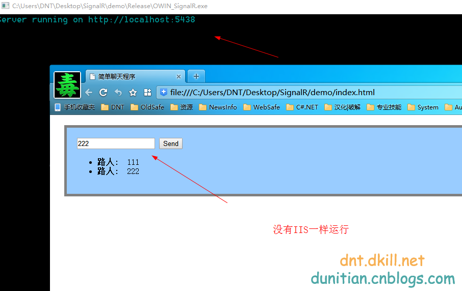 <!DOCTYPE html> <html xmlns="http://www.w3.org/1999/xhtml"> <head> <meta http-equiv="Content-Type" content="text/html; charset=utf-8" /> <title>简单聊天程序</title> <style type="text/css"> .container { background-color: #99CCFF; border: thick solid #808080; padding: 20px; margin: 20px; } </style> </head> <body> <div class="container"> <input type="text" id="message" /> <input type="button" id="sendmessage" value="Send" /> <input type="hidden" id="displayname" /> <ul id="discussion"></ul> </div> <script src="Scripts/jquery-1.8.3.min.js"></script> <script src="Scripts/jquery.signalR-2.2.0.js"></script> <!--动态生成的--> <script src="http://localhost:5438/signalr/hubs"></script> <script type="text/javascript"> $(function () { //日记记录 $.connection.hub.logging = true; //设置hubs的url $.connection.hub.url = "http://localhost:5438/signalr"; // 声明一个代理来引用该集线器。 var chat = $.connection.dntHub; // 创建一个方法供服务端调用 chat.client.addMessage = function (name, message) { var encodedName = $('<div />').text(name).html(); var encodedMsg = $('<div />').text(message).html(); $('#discussion').append('<li><strong>' + encodedName + '</strong>: ' + encodedMsg + '</li>'); }; $('#displayname').val('路人'); // 启动 connection $.connection.hub.start().done(function () { $('#sendmessage').click(function () { //调用服务器端方法 chat.server.serviceSend($('#displayname').val(), $('#message').val()); }); }); }); </script> <!-- 总结一下: 1.先引入jq包,再引入signalR的js包,再引入signalR动态生成的hubs 2.设置signalR的hubs url地址:$.connection.hub.url =xxx 3.声明一个代理对象来引用集线器:var chat = $.connection.dntHub; 4.创建一个客户端方法:chat.client.xxxx=function(){} 5.启动并调用服务端方法: $.connection.hub.start().done(function(){ chat.server.xxx() }); --> </body> </html>如果要调试的话,保证服务端先运行,调试小技巧: