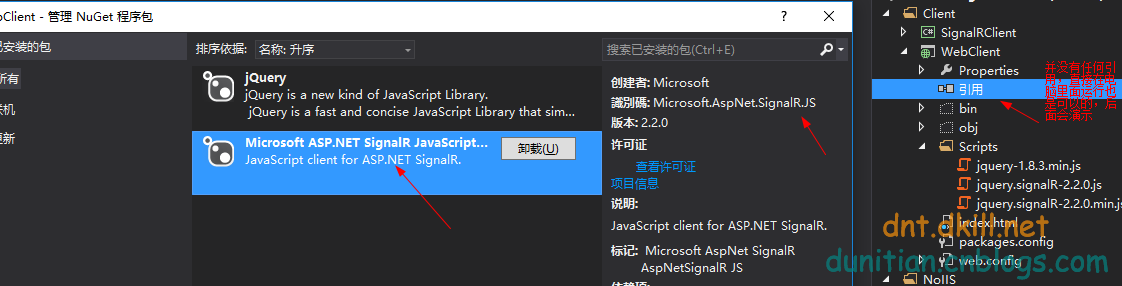 创建一个web的Client,引用一下 SignalR的js包,其实你会发现就是多了几个js包并没有引用任何dll(必须的,不然岂不是太臃肿?)
