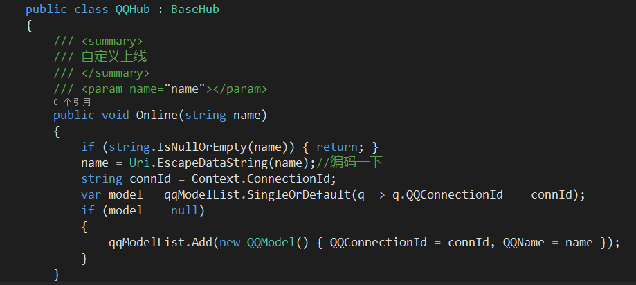 定义了一个上线方法,一会每个客户端都会调用(本来是准备用OnConnected的,没办法他没参数。。。而且这个时候,qq昵称还没有产生,于是我取其次的方案)