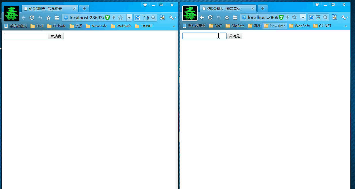<!DOCTYPE html> <html xmlns="http://www.w3.org/1999/xhtml"> <head> <meta http-equiv="Content-Type" content="text/html; charset=utf-8" /> <title>仿QQ聊天--我是美女</title> <link href="Style/MyQQ.css" rel="stylesheet" /> </head> <body> <div><input id="inputMsg" /><input id="btn" type="button" value="发消息" /></div><br /><br /> <div id="main"></div> <script src="Scripts/jquery-2.2.1.min.js"></script> <script src="Scripts/jquery.signalR-2.2.0.min.js"></script> <script src="http://localhost:5438/signalr/hubs"></script> <script type="text/javascript"> $(function () { var rightHtml = [ '<div class="sender">', '<div><img src="http://img.jfdown.com/jfdown/201403/ygald3wajct.jpg"></div>', '<div><div class="left_triangle"></div>', '<span>{msg}</span></div></div>' ].join(''); var leftHtml = [ '<div class="receiver">', '<div><img src="http://tb.himg.baidu.com/sys/portrait/item/306c9328?t=1397975854"></div>', '<div><div class="right_triangle"></div>', '<span>{msg}</span></div></div>' ].join(''); //设置hubs的url $.connection.hub.url = 'http://localhost:5438/signalR'; // 声明一个代理 var qqProxy = $.connection.qQHub; // 创建一个方法供服务端调用 qqProxy.client.sendMsg = function (msg) { $('#main').append(leftHtml.replace('{msg}', msg)); } // 启动 connection $.connection.hub.start().done(function () { qqProxy.server.online('妹子');//QQ昵称 $('#btn').click(function () { //获取输入 var qqmsg = $('#inputMsg').val(); //给逆天发消息 qqProxy.server.serviceSend('逆天', qqmsg); $('#main').append(rightHtml.replace('{msg}', qqmsg)); }); }); }); </script> </body> </html>第三阶段