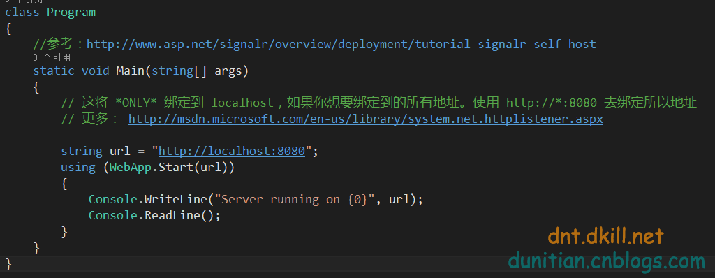 新建一个控制台项目,引入 signalR Self Host (可以思考一下为什么会用NuGet包,他到底好在哪?O(∩_∩)O~不清楚等项目演示完你应该就知道了)