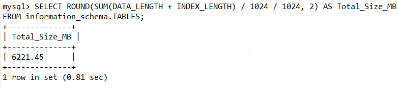 SELECT ROUND(SUM(DATA_LENGTH + INDEX_LENGTH) / 1024 / 1024, 2) AS Total_Size_MB