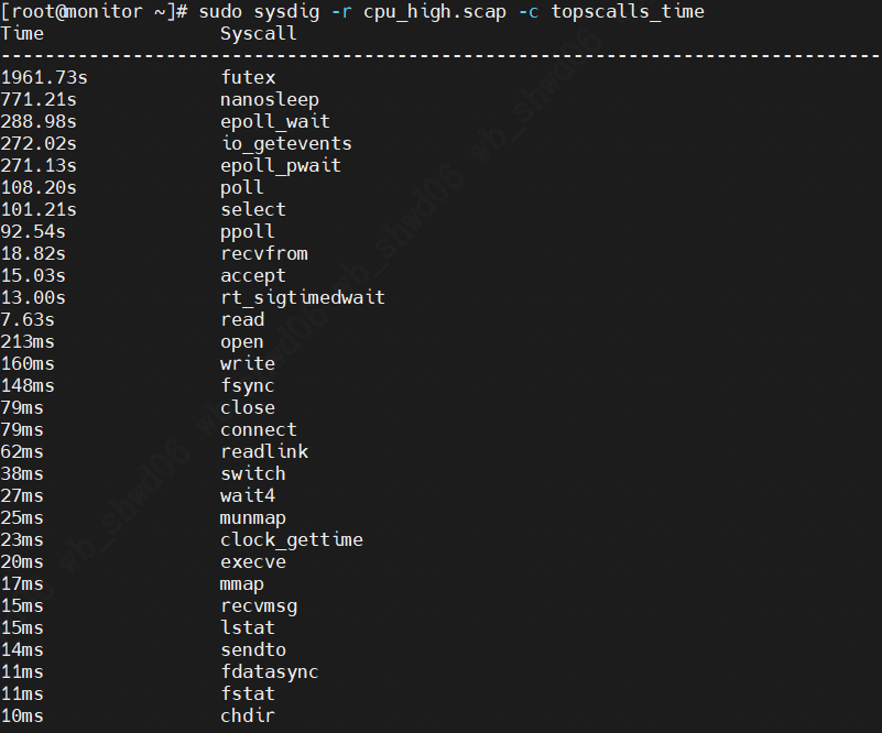 sudo sysdig -c topscalls # 显示最频繁的系统调用