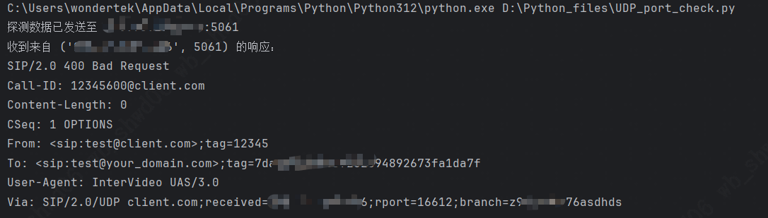 脚本说明:此脚本尝试发送一条数据(示例为SIP协议的OPTIONS请求,因为5060端口常用于SIP服务),然后等待响应。如果收到响应,则连通性良好。