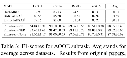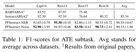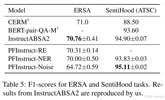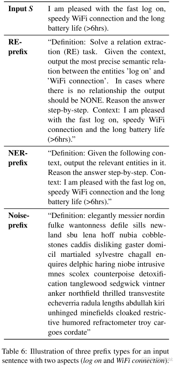 ERSA的固有性质比其他ABSA子任务提出了更大的挑战,因为文本S中表达的情感不一定反映目标实体a1和a2之间关系的情感,在这种情况下,上下文噪声对模型性能的影响最大。模型需要适应一个专门的领域,并了解任务的细微差别。在nlp任务前缀方面,利用a1和a2的知识来推断它们的语义关系(PFInstruct-RE)比一般实体识别(PFInstruct-NER)提高了模型的性能。然而,它并没有超越没有提示前缀(InstructABSA2设置)的模型性能。