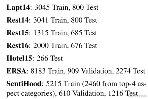 2. 本文额外任务(数据集)介绍:此外,本文还在ERSA和SentiHood任务上评估了本文的模型。其中ERSA是ABSA的扩展任务,给定文本S和两个不同的方面词,目标是预测给定S的方面之间关系的情感极性S。SentiHood任务被定义为ATSC任务的扩展,需要对一个或多个方面类别的每个方面词进行情感分类