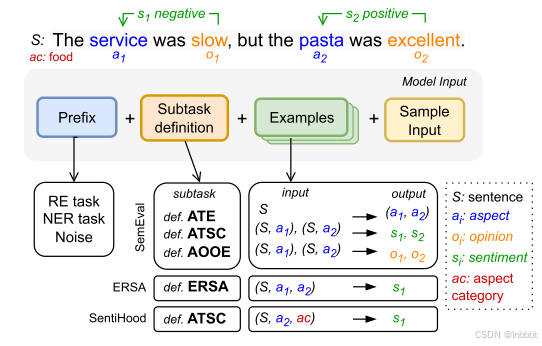 1. ABSA子任务介绍:ABSA任务涉及检测文本S中的意见词o,情感极性s以及与之相关联的方面词a,下图展示了nlp任务相关的前缀、ABSA考虑的5个子任务及对应的输入和输出: