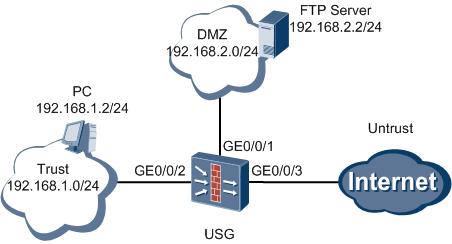 如图所示,一台部署在企业出口,企业内部用户属于Trust区域,通过接口GE0/0/2与连接。FTP服务器等服务器属于DMZ区域,对外部和内部网络提供FTP等服务,通过接口GE0/0/1与连接。的接口GE0/0/3与Internet连接,属于Untrust区域。