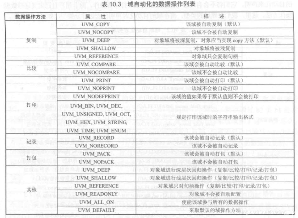 对域的自动化的声明可以定义多种操作 ,新手可默认UVM_DEFAULT或者UVM_ALL_ON,默认可进行全部操作,不过经常进行拷贝操作时,对某些变量声明为NO_COPY类型,防止数据被覆盖。