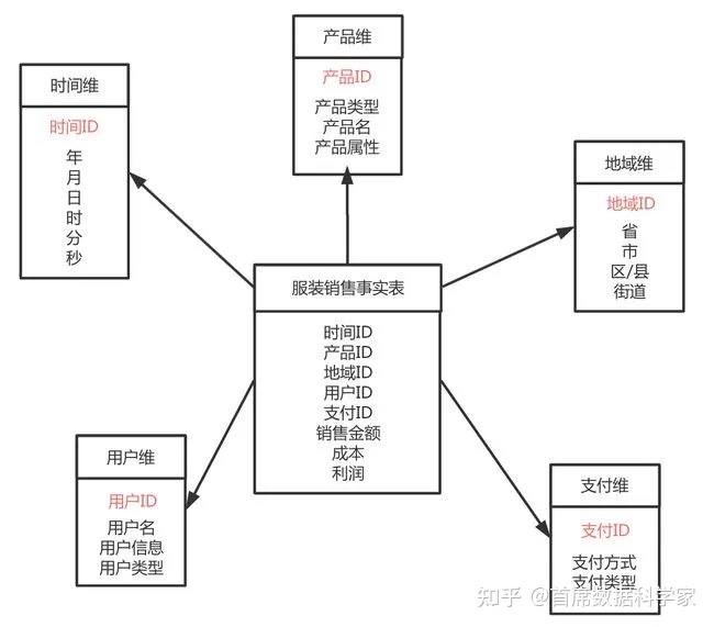 例如上图,包括了五张维度表:时间维表、产品维表、地域维表、用户维表、支付维表。每一张维度表对应现实世界中的一个对象或概念。