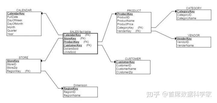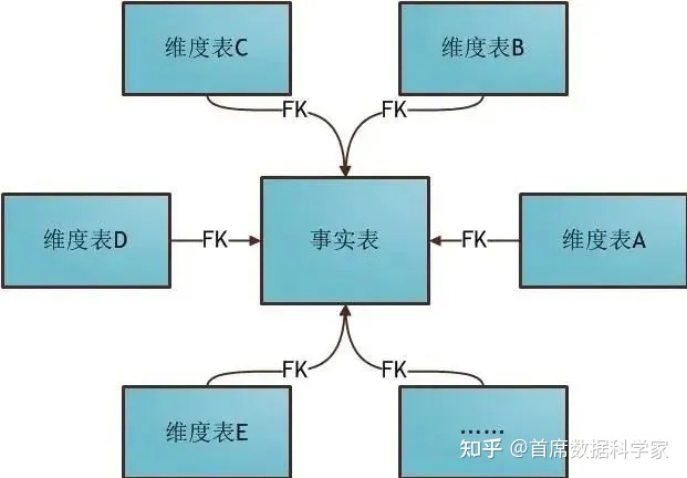 每个维表都有一个维作为主键,所有这些维的主键组合成事实表的主键。
