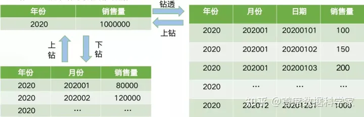 - 下钻:从汇总数据深入到细节数据进行观察或增加新维