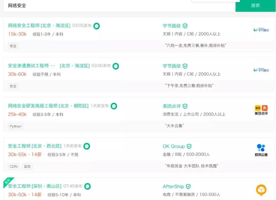 我们到招聘网站上,搜索【网络安全】【Web安全工程师】【渗透测试】等职位名称,可以看到安全岗位薪酬待遇好,随着工龄和薪酬增长,呈现「越老越吃香」的情况。