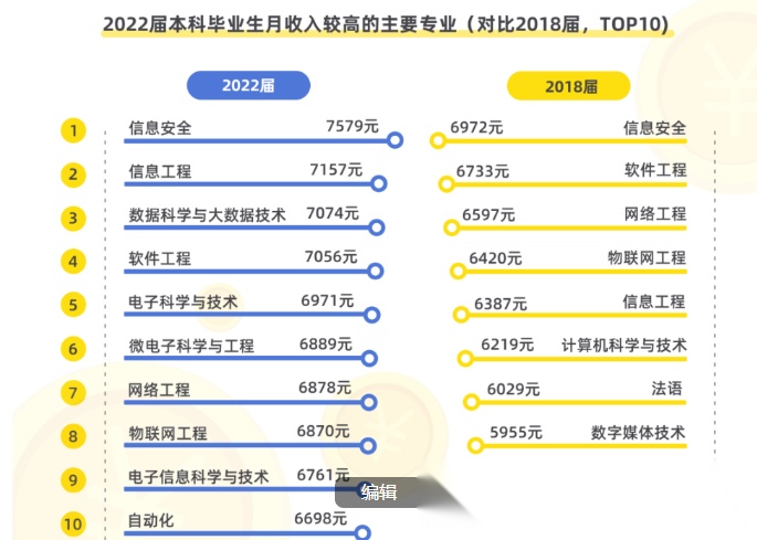 具体看专业,2022届本科月收入较高的专业是信息安全(7579元)。对比2018届,电子科学与技术、自动化等与人工智能相关的本科专业表现不俗,较五年前起薪涨幅均达到了19%。数据科学与大数据技术虽是近年新增专业但表现亮眼,已跻身2022届本科毕业生毕业半年后月收入较高专业前三。五年前唯一进入本科高薪榜前10的人文社科类专业——法语已退出前10之列。