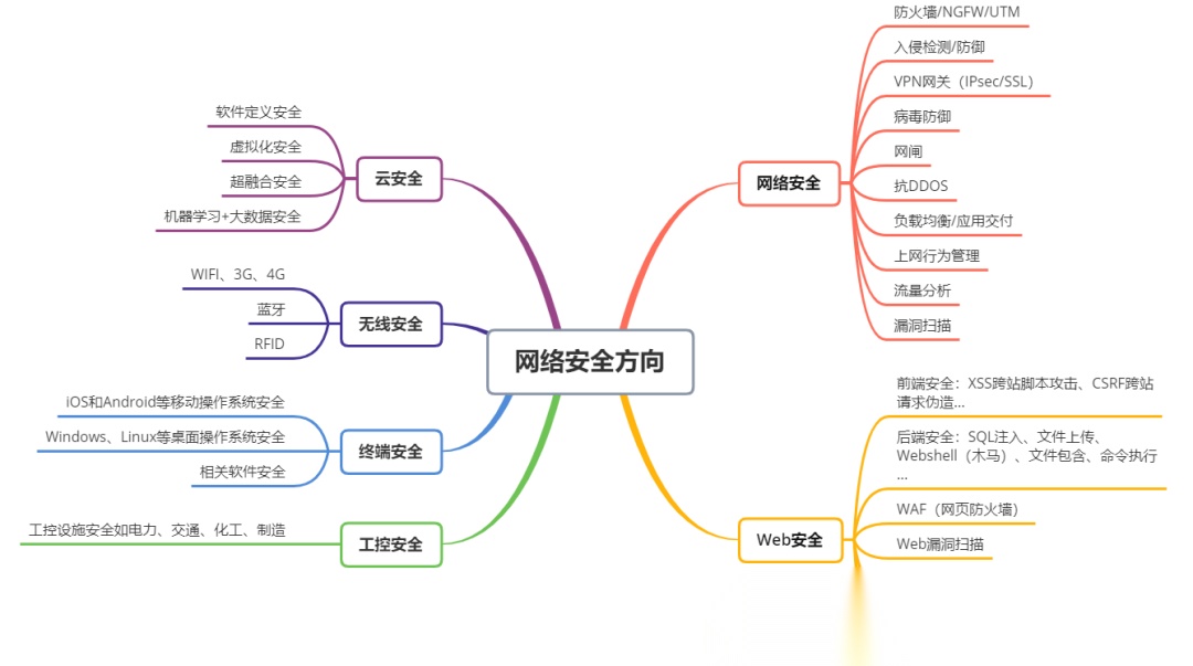 要了解网络安全行业,首先要理解网络安全技术的整体框架。按照应用场景和技术栈,安全行业一般可以细分为以下方向 =>