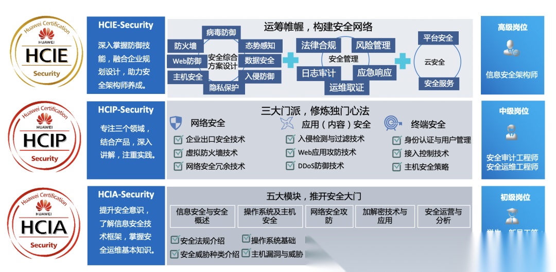 网络安全的学习,尤其是网工如果想要快速学习安全技术,可以从华为安全认证开始。51CTO华为安全课程项目组钻研数年,为网工人学习安全技术与架构出品了一套专业的学习路线,是网工职业转型和晋升的专业解决方案。