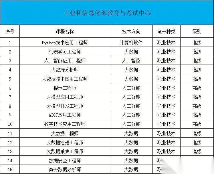 | 软件测评工程师 | 中级 | 工业和信息化部教育与考试中心 |