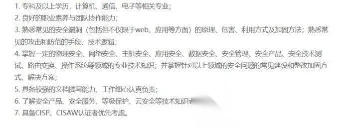 大企业对于应聘人员的要求还是比较高的,从岗位要求可以看出:应聘者需对安全漏洞及其原理有深入理解,并且拥有丰富的网络安全专业知识。对于操作系统、网络协议、网络设备等也应具备一定的熟悉度。
